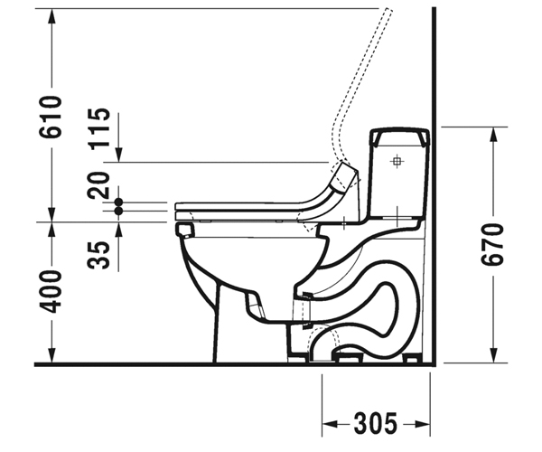 型号 212001 美式座便器, 适用于 SensoWash® Starck, 加长型带虹吸喷头, 305 mm/12" 坑距, 带单冲水装置,带侧面提拉杆, 3"/80 mm 挡板阀, 垂直出水, 1.28加仑/冲 (4.8升) 附加信息 适用于SensoWash®电子座便器座圈,请见xxx页。 Philippe Starck 设计 尺寸:370 x 715 mm 可变形式 ©2120010001