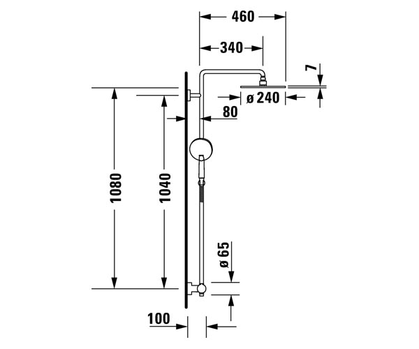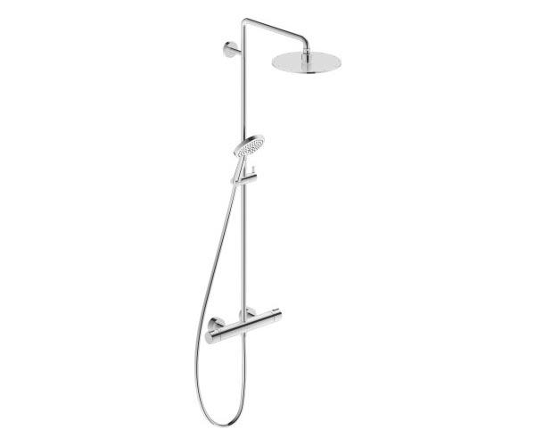 控温器盒, 安全温度定在38°C, 连接件尺寸 DN15, 软管连接件 DN15, 流率 12,6 升/分钟 (3 bar), 花洒喷头角度可调调节, 高度可调节的手持花洒柄, 连接软管内有止回阀, 伸出长度350mm, 包括:包括淋浴软管1600mm,,手持花洒air Ø 120 mm,淋喷头 Ø 240 mm, 推荐在压力 3-5 bar下进行操作, 1200 mm