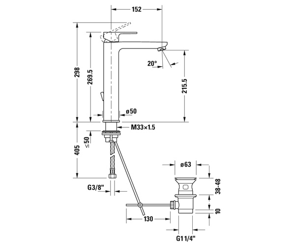 陶瓷混合系统, 投射距离 152 mm, 连接软管 3/8", 起泡器可调节, 流率 5,3 升/分钟 (3 bar), 标准喷雾, 表面镀铬, 温度范围可调节, 推荐在压力 3-5 bar下进行操作, 带下水器套装, 270 mm