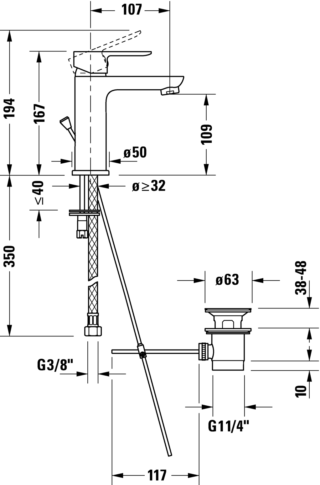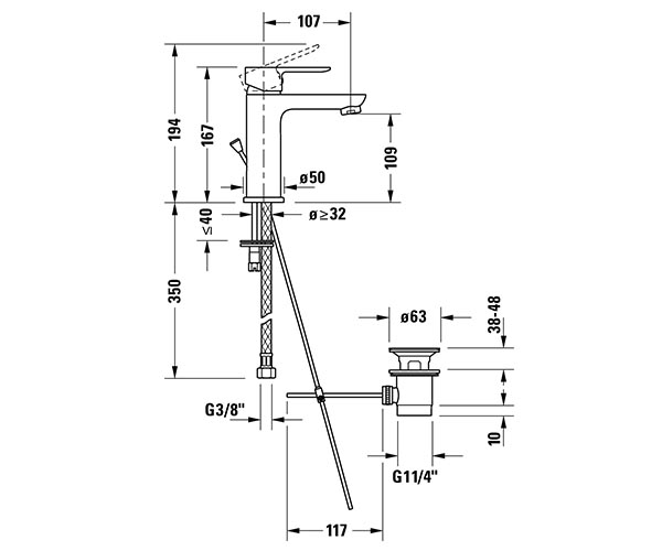 型号 A11020001 陶瓷混合系统, 伸出长度 107 mm, 连接软管 3/8", 标准喷雾, 表面镀铬, 温度范围可调节, 推荐在压力 3-5 bar下进行操作, 带下水器套装, 167 mm 尺寸 167 mm 可变形式 流率 5,5 升/分钟 (3 bar) A11020001010