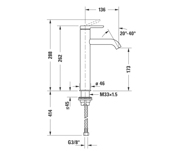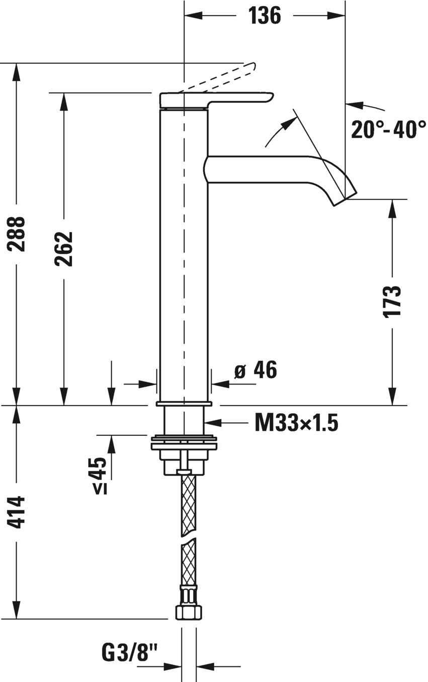 陶瓷混合系统, 伸出长度 136 mm, 连接软管 3/8", 起泡器可调节, 标准喷雾, 推荐在压力 3-5 bar下进行操作, 不带下水器套装, 262 mm