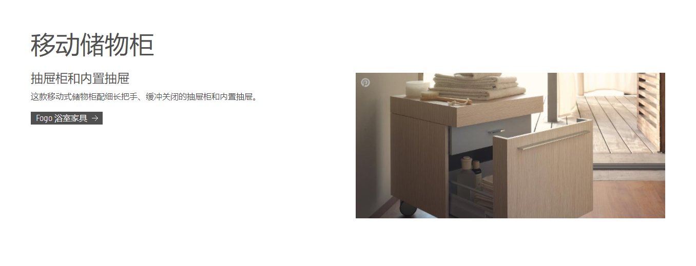 浴室中的实木家具 室中的实木家具——人们越来越需要一个温暖、迷人且舒适的家。Fogo 浴室家具系列创造了完美的设计。五种实木饰面供您选择,让您体验指尖上的舒适奇妙感。台面、浴柜、高浴柜、镜柜以及移动储物柜,共同享有实木外观的自然魅力,更具备时尚、干练的线条美感。极致精湛的设计手法,细心雕刻每一细节,成就永恒之美。